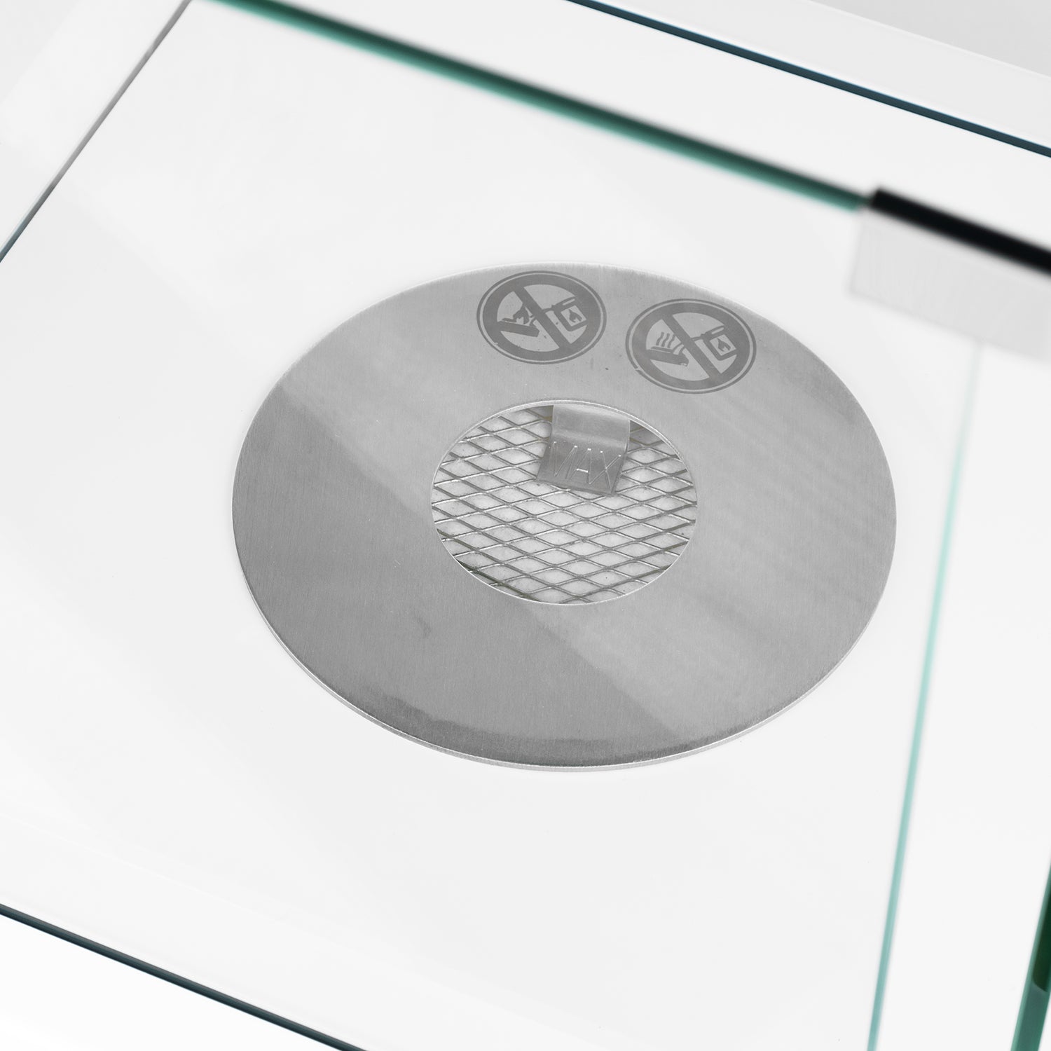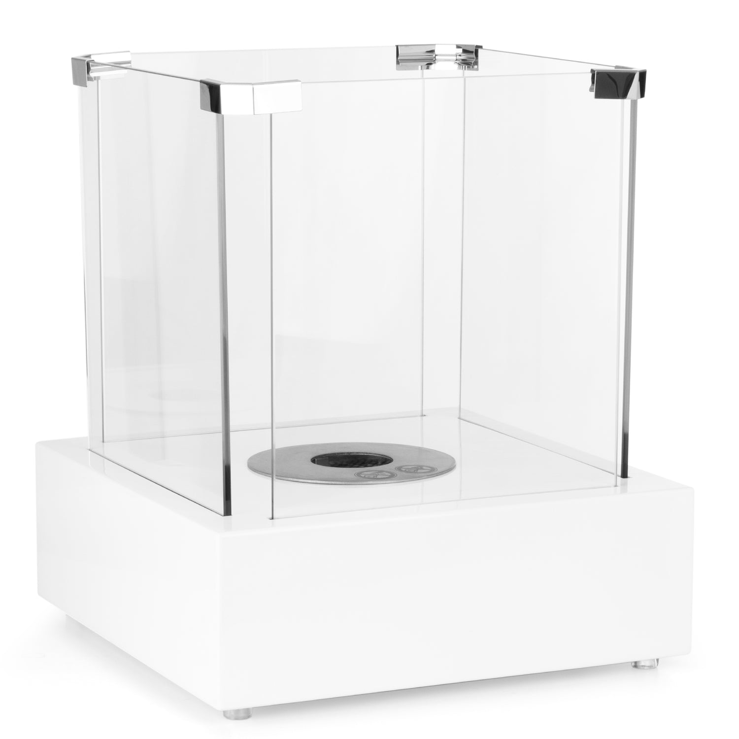 Tischkamin aus Stahl in pulverbeschichtet weiß mit Sicherheitsglas.