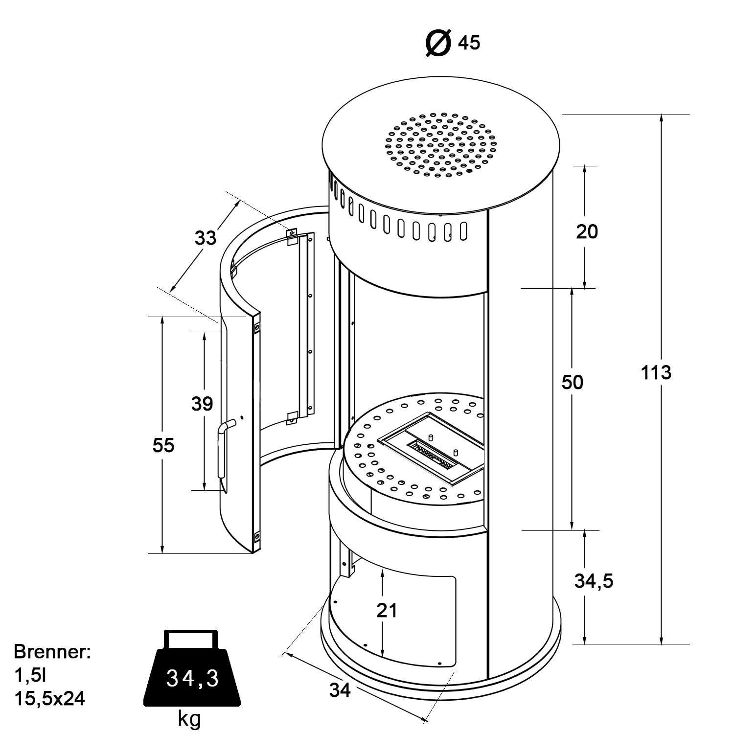 - Brennkammer: 24 cm 32nbsp;15 cm x 6,1 cm (B x T x H)